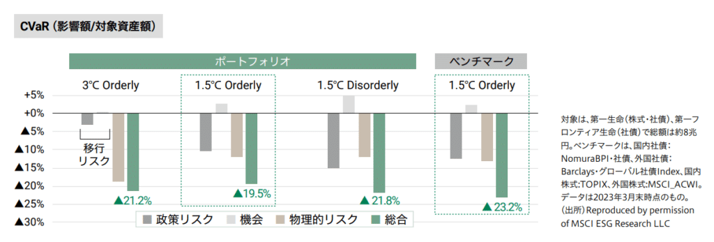 第一生命ホールディングスは、CVaR(気候バリューアットリスク)手法を用いて政策リスクと機会、物理的リスクを分析しています。保有資産に対する各シナリオにおける影響を「影響額/対象資産額」という形で定量的に示しており、移行リスクの影響は小さく、物理的リスクは3℃シナリオにおいて大きいことを明確にしています。また、試算根拠として過去実績や外部文献も記載することで、分析の透明性を高めています。