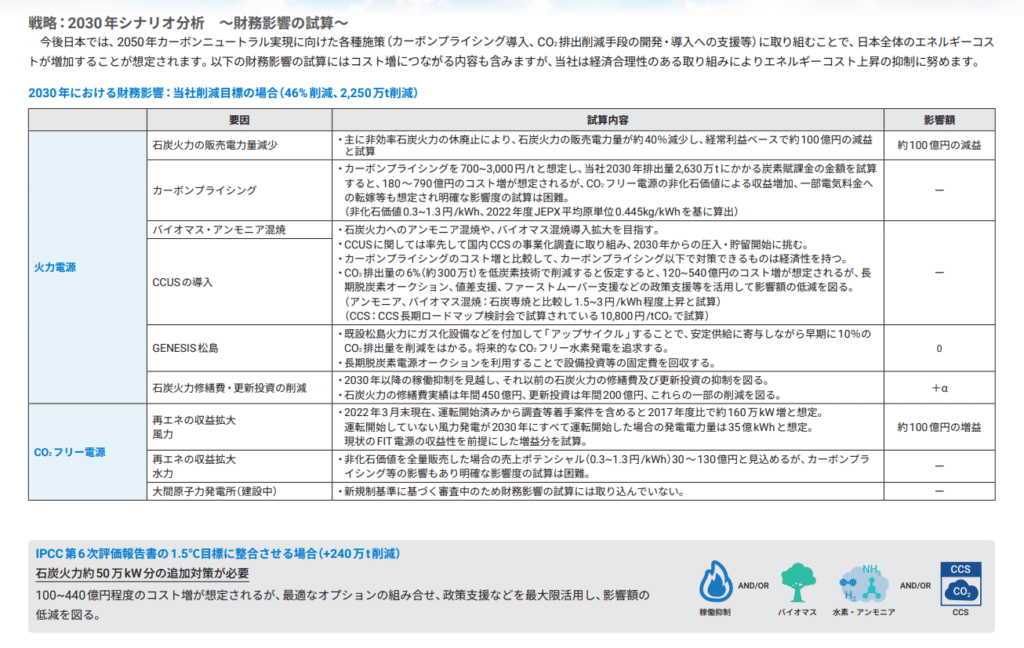 J-POWERグループは、2030年のシナリオ分析において、火力や再エネ事業への財務的影響を試算しています。想定される世界観に基づき、カーボンプライシングを700~3,000円/tCO2と設定し、火力事業への影響として販売量減少による約100億円の減益を定量的に示しています。このように具体的な前提条件と試算結果を明示することで、投資家が影響度を理解しやすい開示を実現しています。