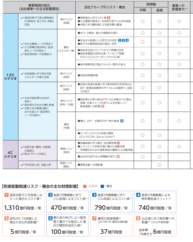 中国電力は、気候変動リスク・機会の財務影響について定量的に評価し、各リスク・機会による財務的影響を具体的な金額で記載しています。とくに注目すべき点は、1.5℃/4℃シナリオのいずれにおいても事業がレジリエンスを確保していると明示していることです。これにより、どのようなシナリオが実現しても事業継続が可能であることをステークホルダーに示しています。