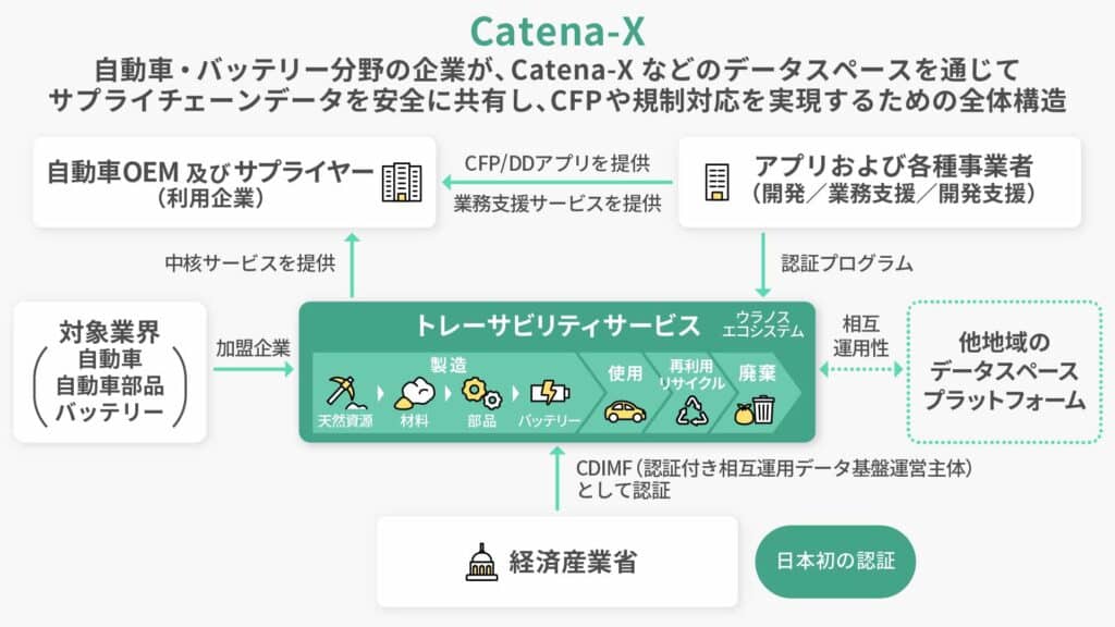 日本政府はウラノス・エコシステムを通じてCatena‑Xと連携し、企業間で安全にデータをやり取りできる共通基盤を整備しています。